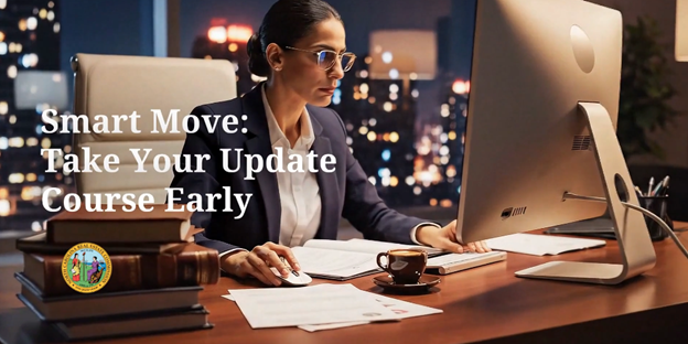 Script: Although brokers can take the Update course anytime between July 1 and June 10, the smart move is to take it early! Doing so keeps you current on the latest law and rule changes—so you are in compliance with License Law and Commission rules. Waiting until the spring could mean you’ve been practicing brokerage with outdated understanding of the law or rules for several months.